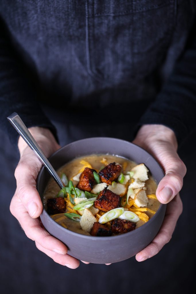 4. Transfer half to a blender, allow to cool, then blend until smooth. Add more broth if you’d like.